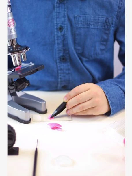 Le parfait matériel des scientifiques en herbe ! Un microscope de 23 cm avec objectifs, filtres de couleurs et 3 grossissements : x200 / x600 / x1200. Le pied et le corps du microscope sont en métal. Un éclairage LED pour des observations de qualité. Nombreux accessoires inclus : lames, pince, 4 fioles, boîte de Petri, micro-trancheuse, étiquettes, aiguille et 4 lames d’échantillons.