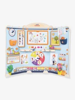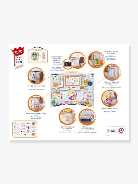 Ils pourront retrouver de nombreuses caractéristiques présentes dans les salles de classe : ardoise (blanche magnétique ou surface craie), horloge pour indiquer et apprendre l’heure, cartes personnalisables pour établir la liste des élèves présents et absents, frise pour se repérer dans l’espace, roue pour apprendre les chiffres/les activités journalières/les couleurs, train des anniversaires, arbre à météo, cartes pour apprendre les parties du corps, …