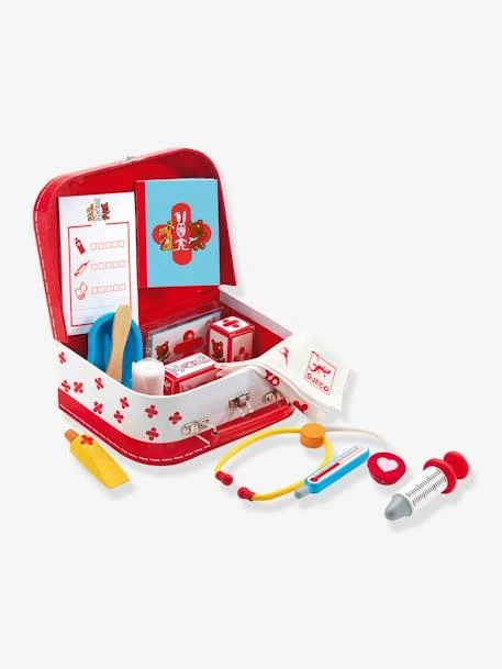 - Contient : 1 mallette en carton, 1 seringue en bois, 1 thermomètre en bois, 1 spatule en bois, 1 stéthoscope en bois et plastique, 1 bassine en plastique, 1 tube de crème, 6 pansements élastiques en tissus, 2 bandes blanches et 1 tapis en tissu, 1 carnet d’ordonnance et 1 carnet de santé.
